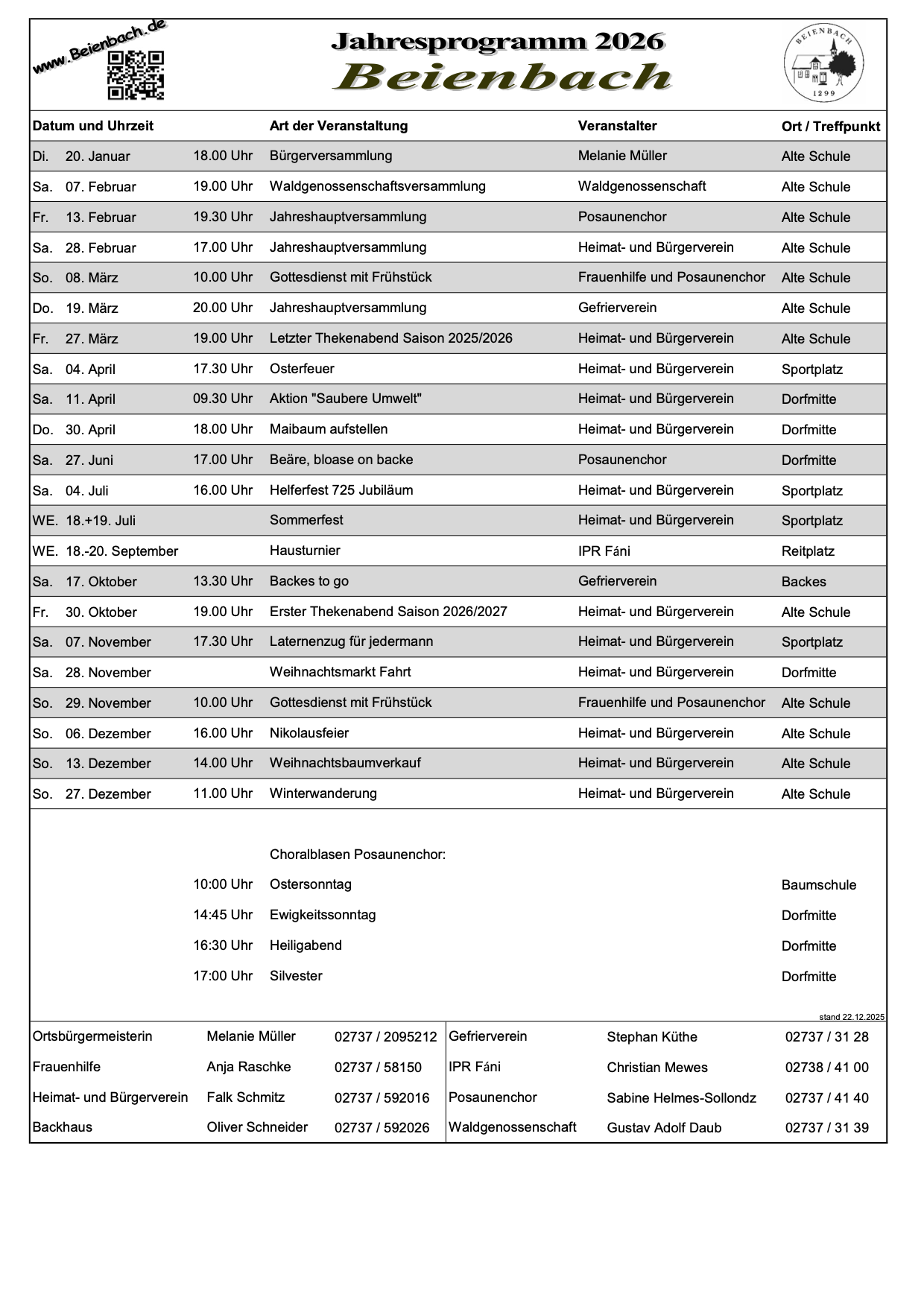 Auch im Jahr 2026 bietet Beienbach wieder ein abwechslungsreiches Jahresprogramm mit zahlreichen Veranstaltungen für alle Generationen. Über das ganze Jahr hinweg laden Vereine, Gruppen und Gemeinschaften zu Festen, Treffen, Aktionen und besonderen Terminen ein. Das Programm zeigt eindrucksvoll, wie lebendig das Dorfleben ist und wie sehr Zusammenhalt und Engagement das Miteinander in Beienbach prägen.